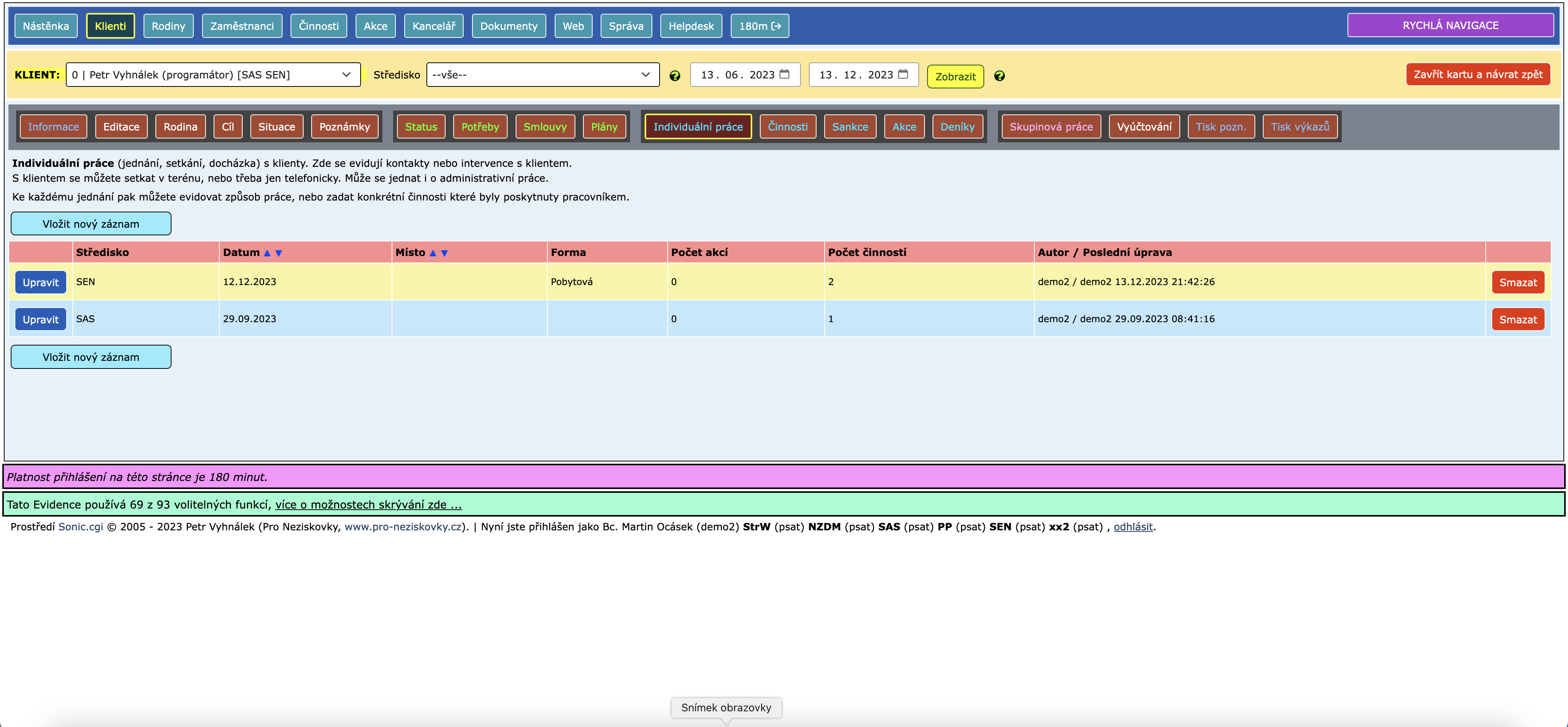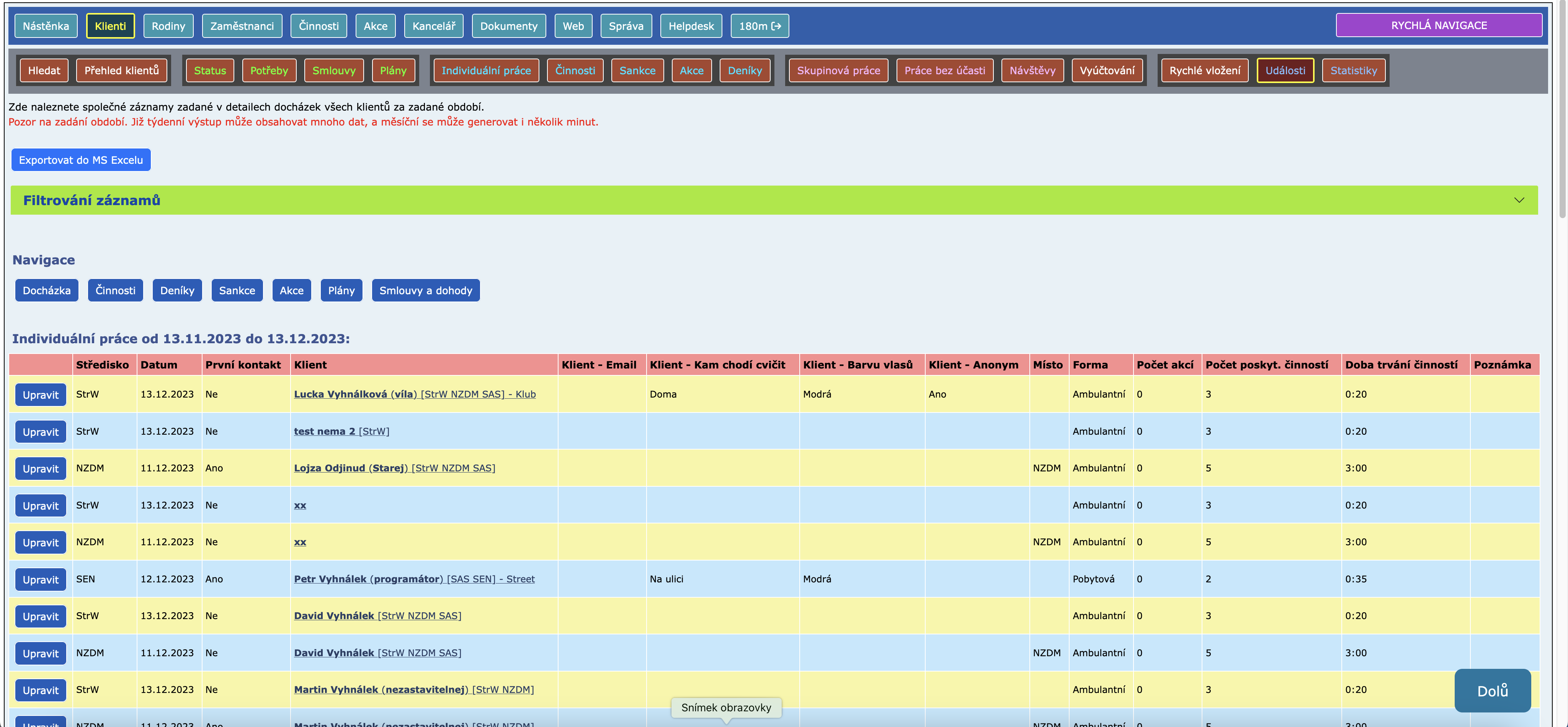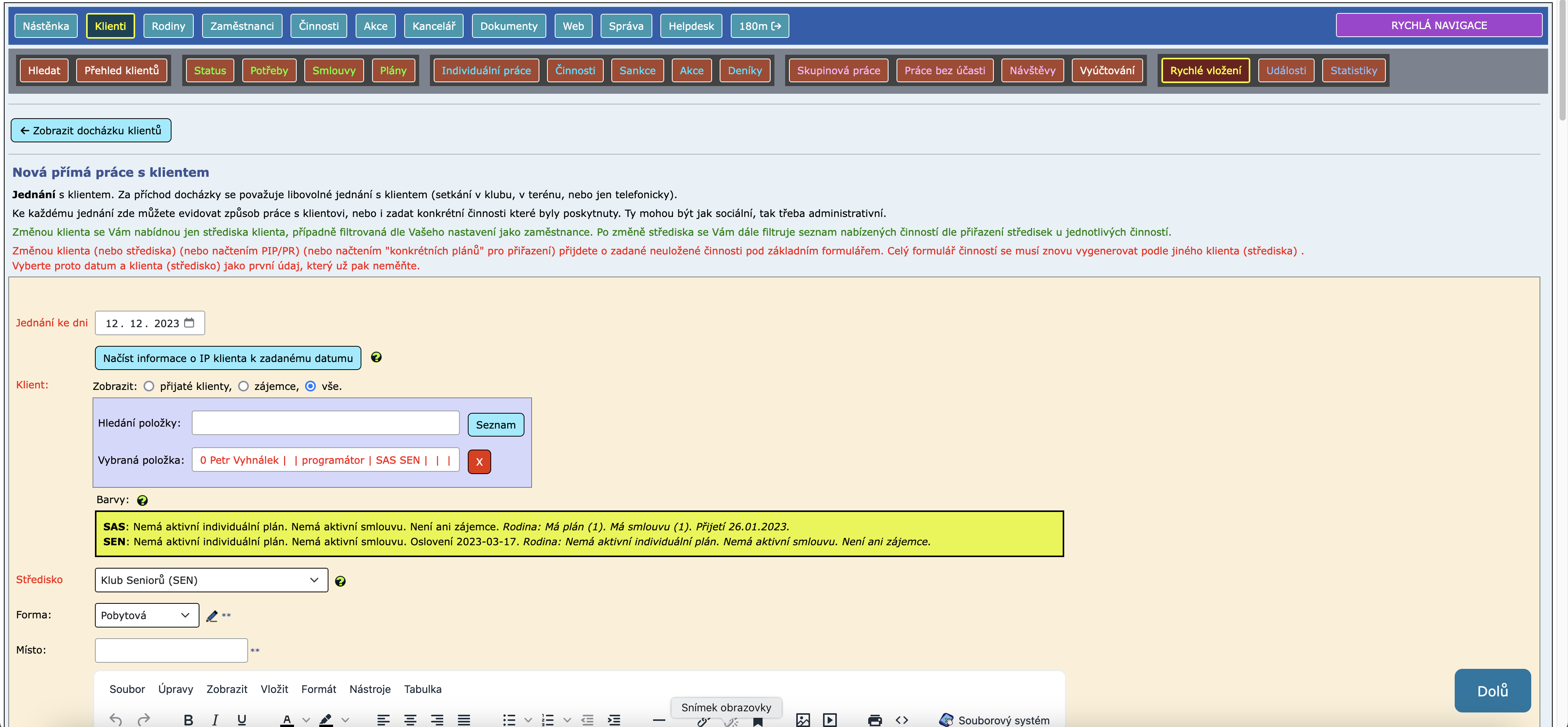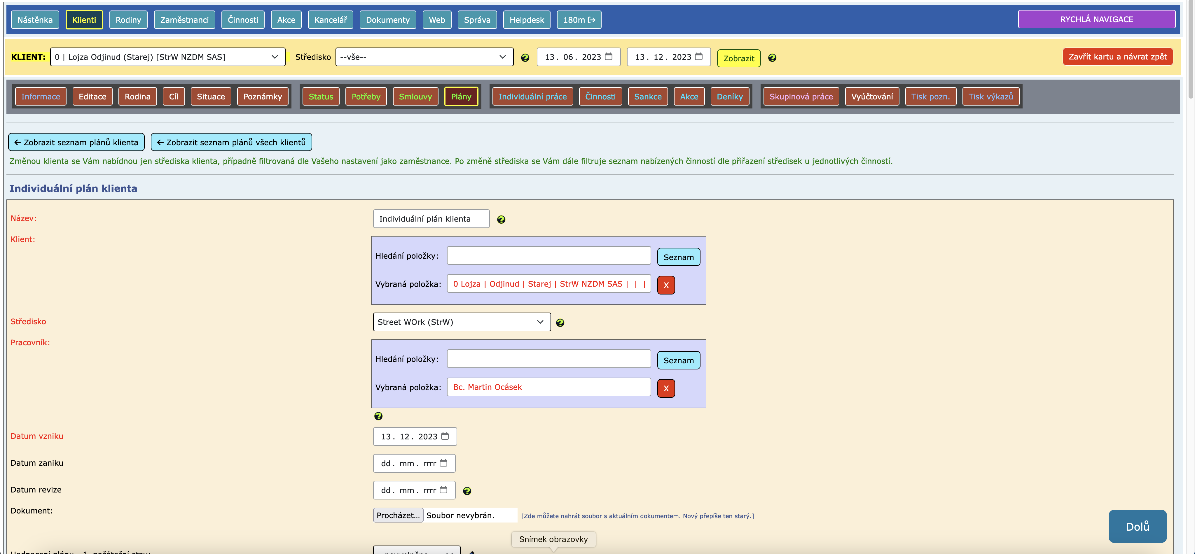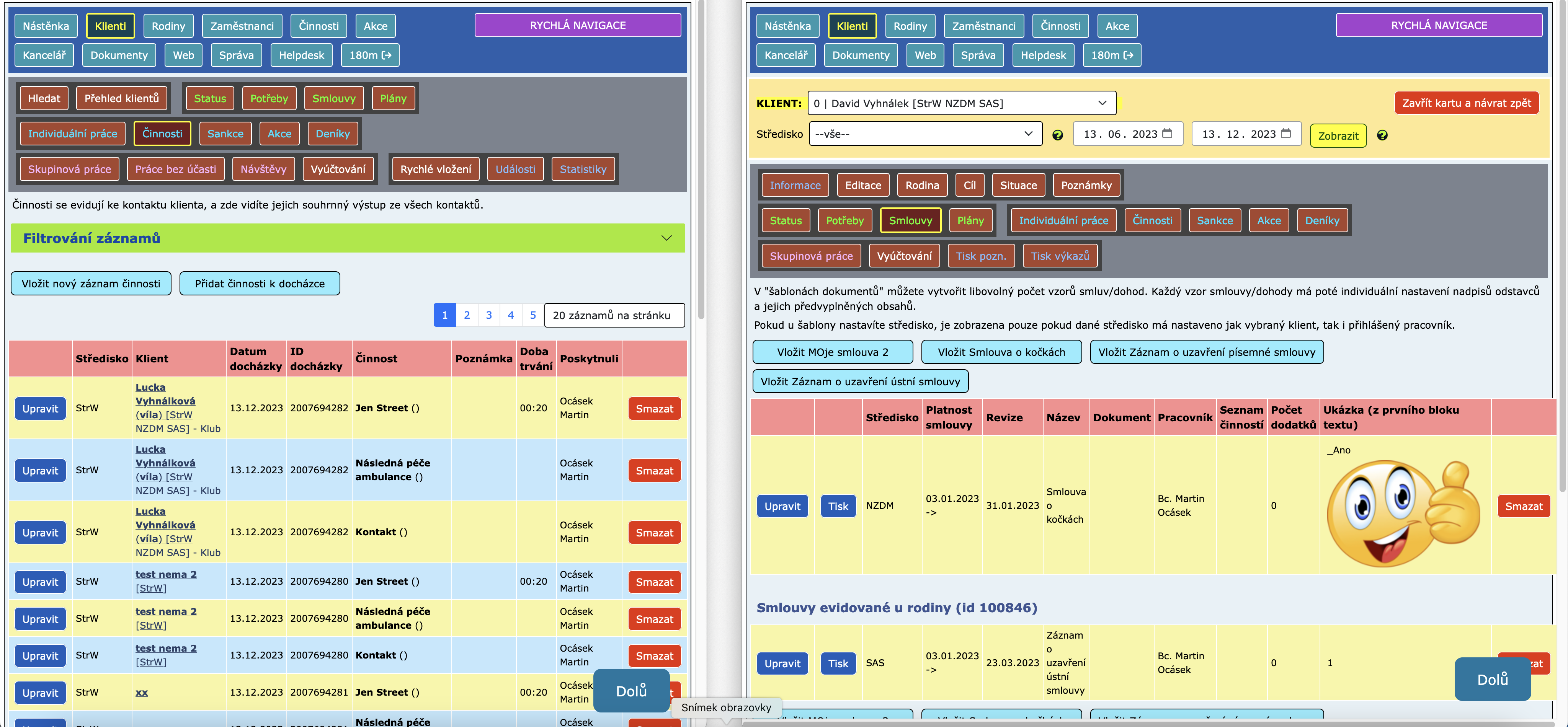 - Evidence smluv, individuálních plánů a přímé práce s klienty.